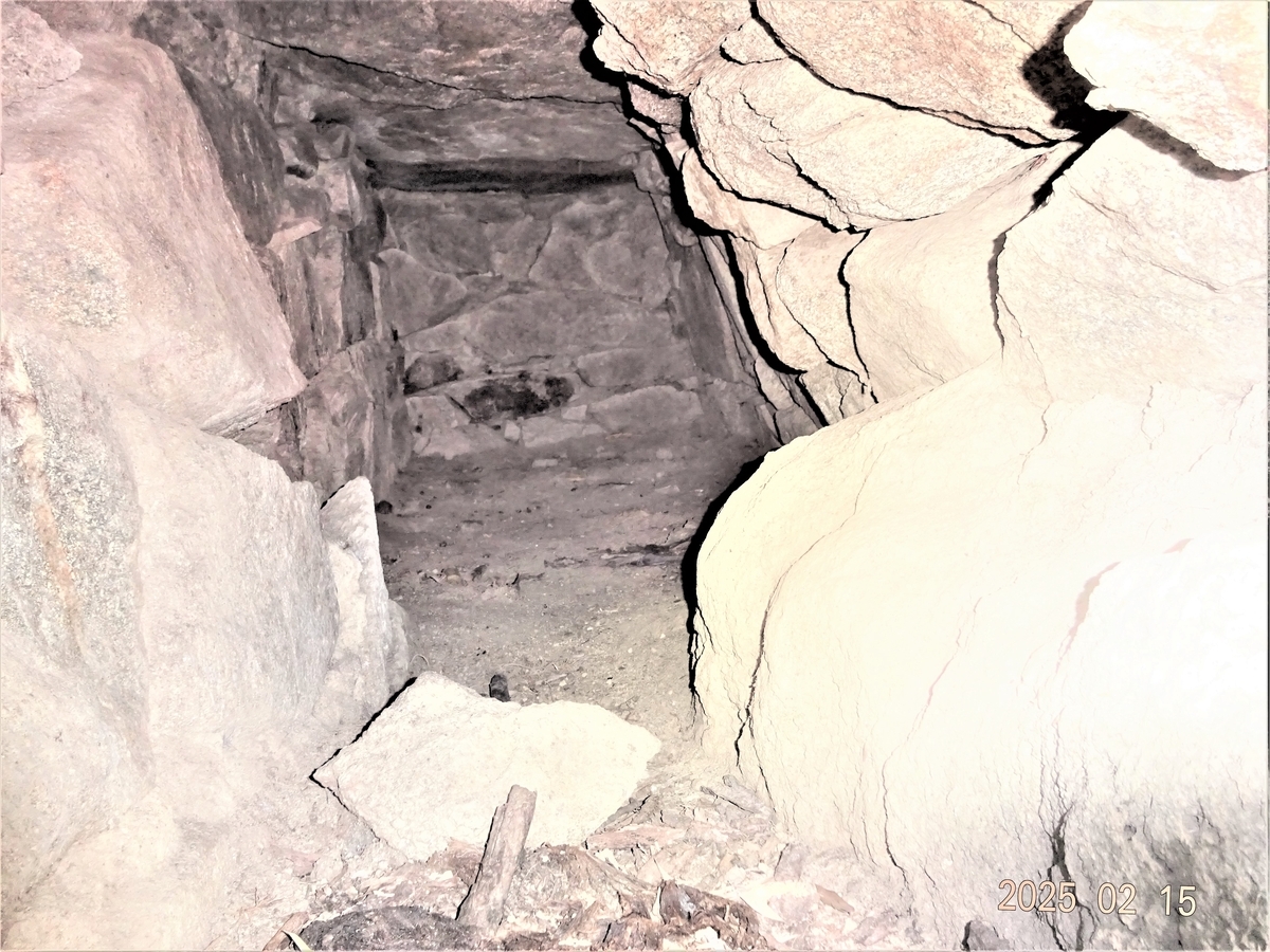 玄門付近の隙間から自撮り棒で撮影。玄室は表面が比較的丁寧に仕上げられている。