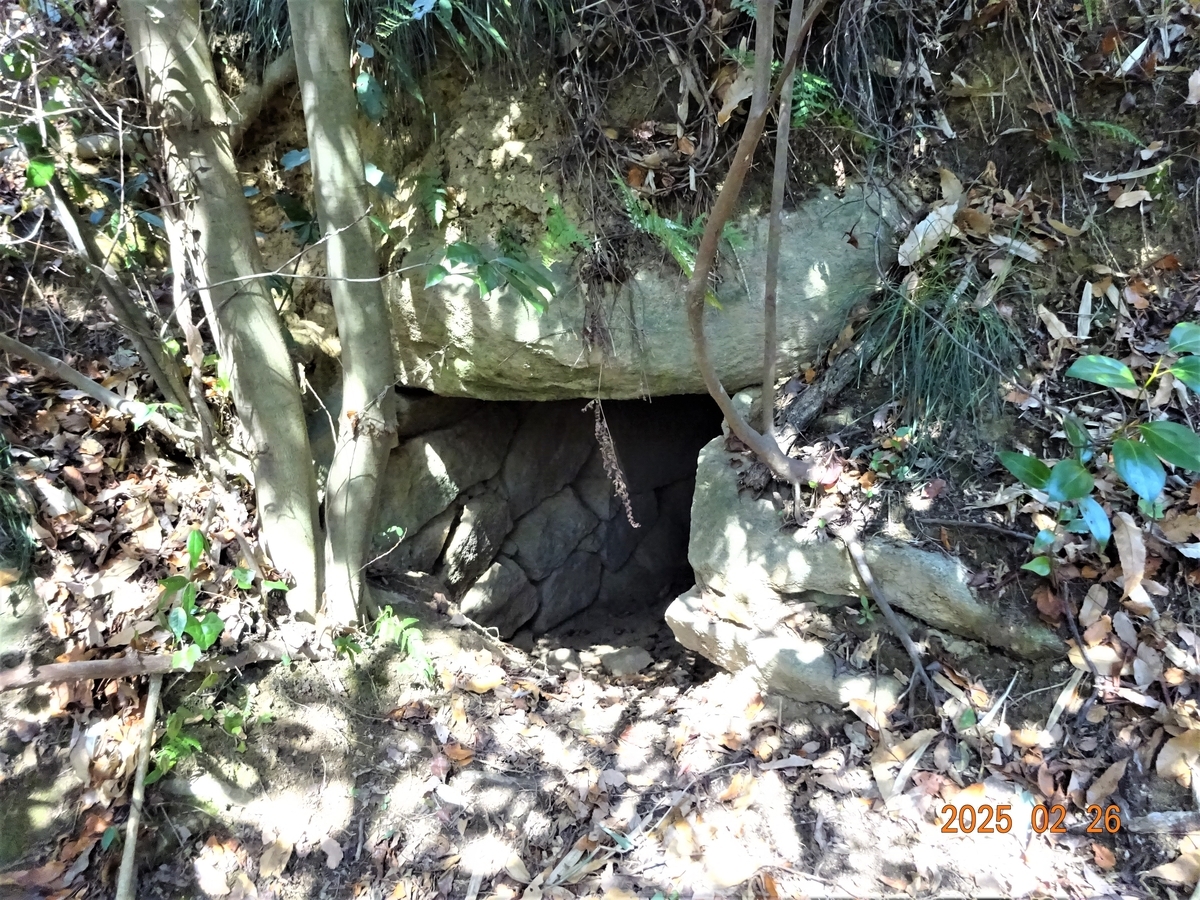 ーーーーー第34支群は、東側の枝尾根全体に分布。石室の石を抜き取った痕跡の古墳も存在したが良好な保存状況で完存している古墳も多くある。古墳は、丘陵尾根の稜線上と南側斜面、その稜線の東側へ伸びた短い小枝尾根上で谷筋に近い山腹部にもある。密集して連なり隣接した墳丘の一部が重複している所もある。古墳規模の大小や石室形態の片袖、両袖、無袖、小石室、横口式石榔等多彩な形態があり、大半が円墳であるが方墳と考えられるものも5基ある。果樹園等耕作があまり行われなかったのでよく遺存したのであろうか。尾根の幅が広い部分は、2基並列し、狭い部分は精一杯まで尾根を使用して古墳を築造している。-----とある。