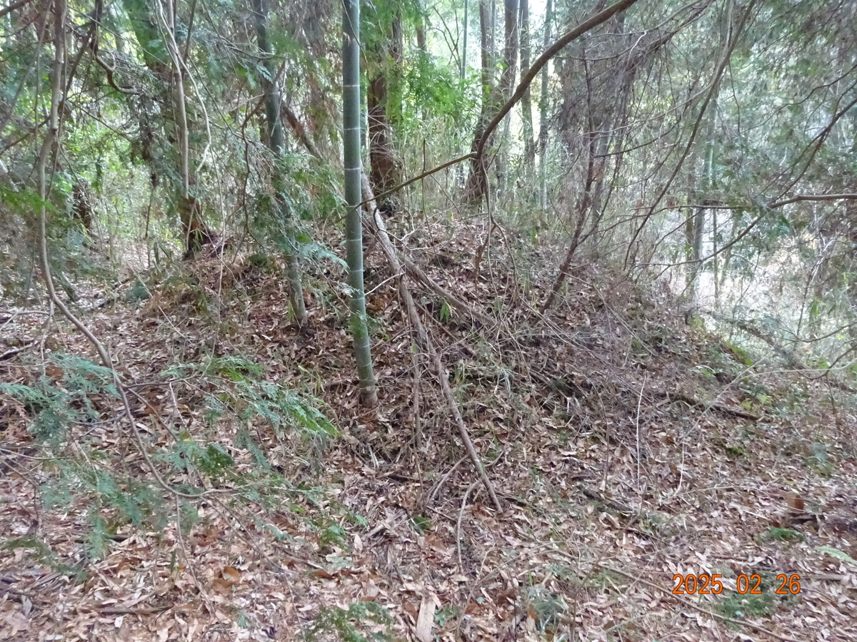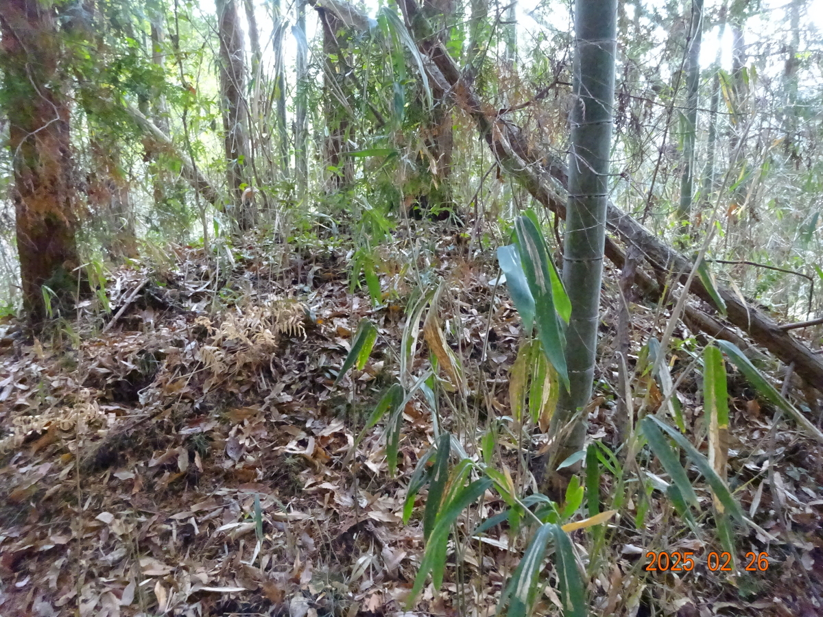 45・46号墳は前記の2号墳から東に伸びる小枝尾根にある。2号墳のすぐ東側は倒れた竹が折り重なっていて直接小枝尾根に降りられないので、少し北側から迂回する(かなり急斜面)。